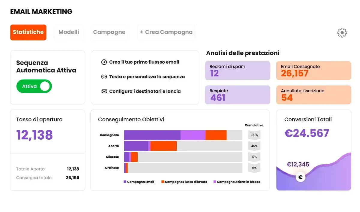 Crea campagne, newsletter e sequenze automatiche che nutrono i contatti e li preparano all'acquisto.