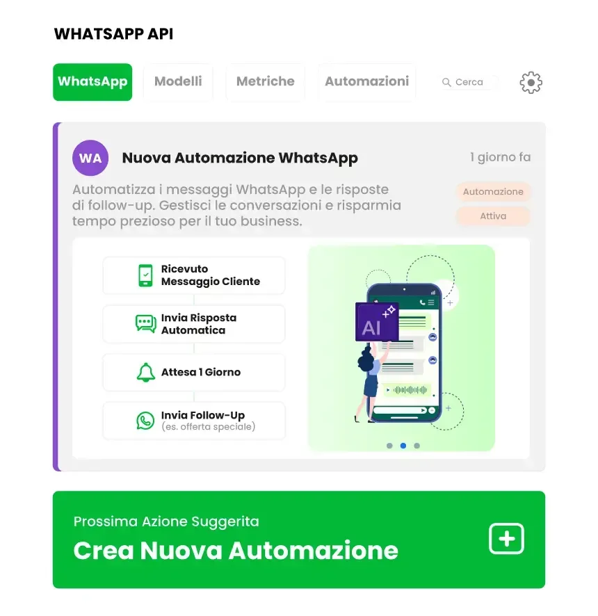 WhatsApp è il canale più fico che hai. Il problema è che qualcuno deve scrivere ai clienti. Con le automazioni della Suite, l’invio di messaggi e le risposte di follow-up girano da sole, senza che tu prenda il telefono ogni 5 minuti.