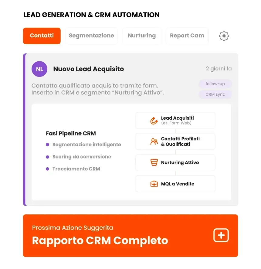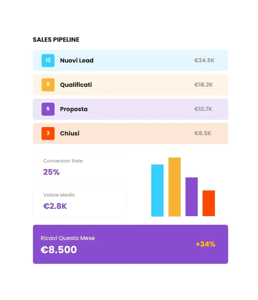 Ogni contatto che entra viene tracciato, qualificato e seguito in automatico. Niente più lead persi, niente più post-it sulla scrivania. Il CRM sa già chi ha bisogno di attenzione. Tu devi solo chiudere le vendite.