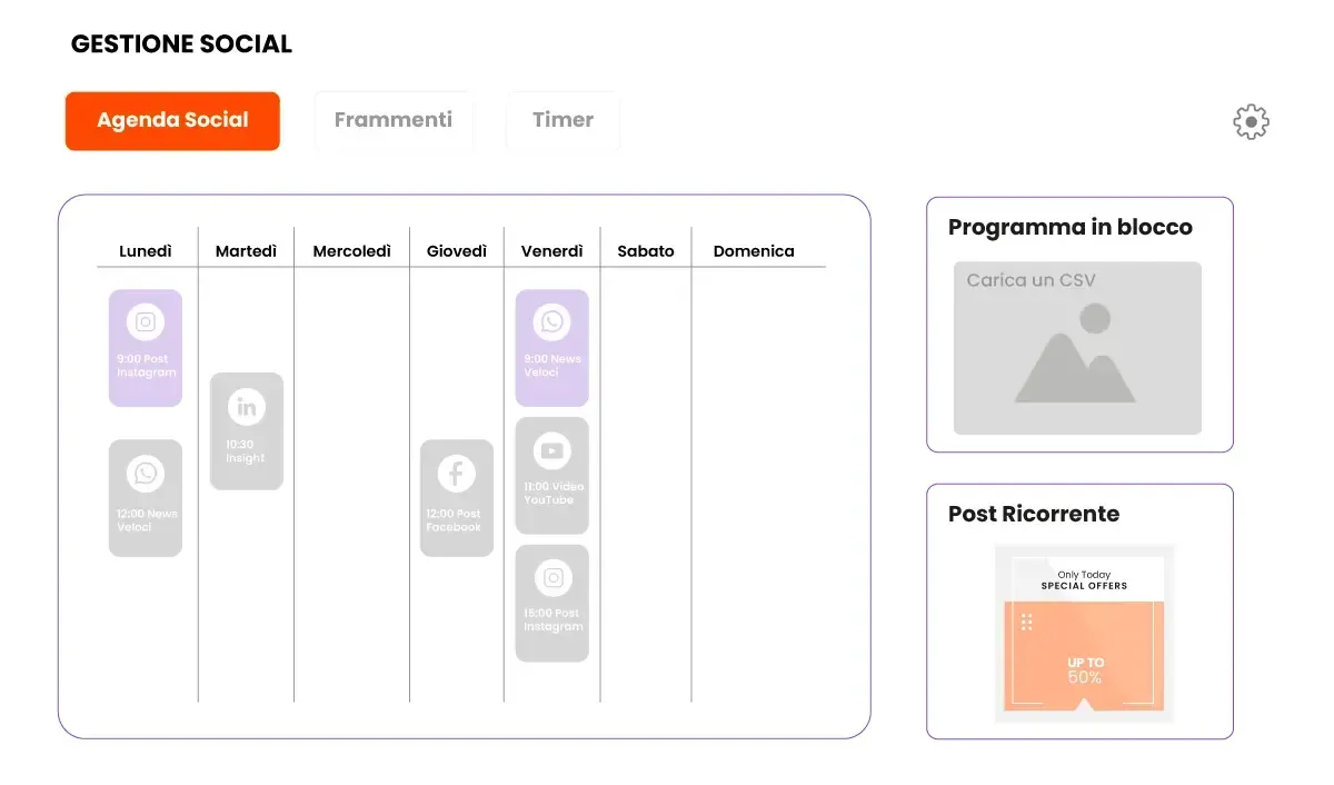Pubblicare ogni giorno richiede tempo che non hai. Pianifica i contenuti una volta, la Suite li pubblica su tutti i canali al momento giusto. La tua presenza online non dipende più dal tuo umore del lunedì mattina.