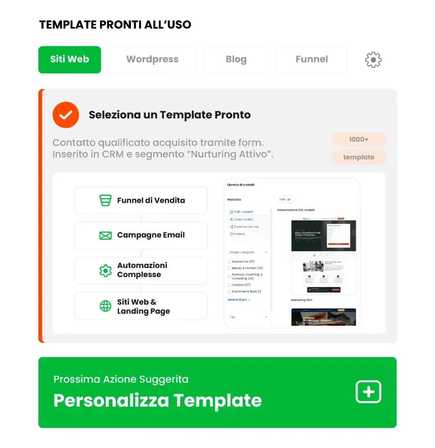 Non devi inventare niente da zero. Email, funnel, automazioni e pagine già costruite, testate e pronte all’uso. Scegli quello che ti serve, metti il tuo logo e metti il pilota automatico. Oggi, non tra sei mesi.