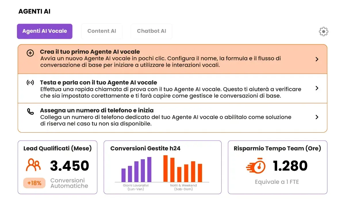 I tuoi clienti fanno domande anche alle 23:00. Gli agenti AI rispondono, qualificano e gestiscono le conversazioni al posto tuo. Su tutti i canali, h24. È come avere un commerciale in più, che non va mai a casa. Mai.